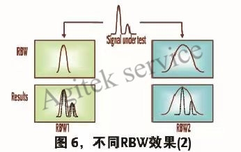 图5,在不同分辨率带宽下,RBW滤波器如何区分两种信号。将两个等幅信号通过两种RBW滤波器滤波,其中RBW1的分辨率优于RBW2。从结果可以看出,当通过较窄RBW1滤波器时,能清晰分辨出两种信号,但是通过较宽RBW2滤波器时,结果就不如RBW1。橙子视频下载可以预测到,如果RBW2的分辨率带宽更宽,橙子视频下载甚至会将结果误认为是一个信号。当两个信号的频率十分接近时,这种情况机会发生。另一种情况是,当两个信号的幅值差距很大,RBW1仍能够检测到较小信号,但是RBW2却不能,如图6所示。所以这些滤波器又称为分辨率滤波器。