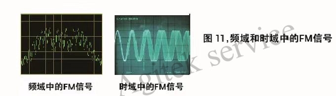 时域中的FM信号比AM信号更复杂,如图11所示。AM信号是幅值调制,而FM信号是频率调制。在FM信号中,频率经调制后以一定偏移量进行扫描,但是该偏移量却在时域很难测量。然而频谱分析仪却能直接显示出载波频率、调制信号频率、偏移量和带宽。