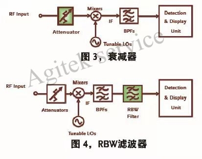 将衰减器置于射频输入路径,扩宽了输入信号准位的动态范围或对频谱分析仪增添了更多的输入保护。参考图3,衰减器将来自混频器(RF中部)的信号准位限制在一定范围内,如果输入信号超过参考准位,将会引起测量误差或伪噪声,这就是为什么某些频谱分析仪会在特定信号条件下列出仪器规格,包括混频器中具体的信号准位。