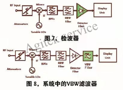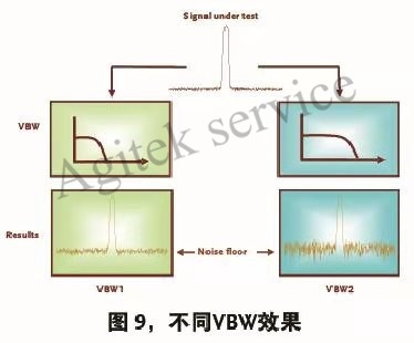 在直流电压进入显示单元之前,需要将检波器产生的噪声压缩,这个滤波器成为视频滤波器,它的带宽成为VBW,系统如图8所示,视频来自电视广播系统。视频滤波器也作为后置滤波器,图9呈现出VBW对显示输出的影响。如果待测信号通过两个VBW滤波器,其中VBW1小于VBW2,结果显示VBW2的底噪要比VBW1大。换句话说,视频滤波器将底噪平均了。但要注意的是,底噪准位并没有改变,VBW滤波器仅平均噪声准位,并不影响信号底噪的总体幅值。
