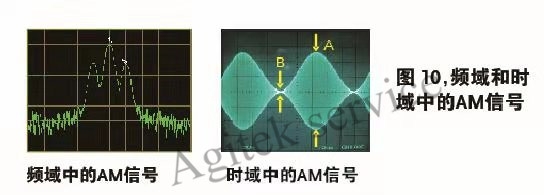 图10为AM信号在频域和时域的测量结果。在时域中,AM调制指数由A和B的大小决定。但是用示波器很难精确测量调制指数和载波频率。