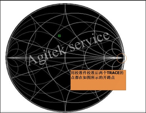 3)开始端口校准,此时候需分辨校准件是有源还是无源,若是无源的校准件分别较准Open、Short、Load;若是有源的校准件,依次选择CAL、ECAL和需要校准的端口后会自动校准。最后校准后要保证在两个端口的位置都固定在开路点,如下图所示。