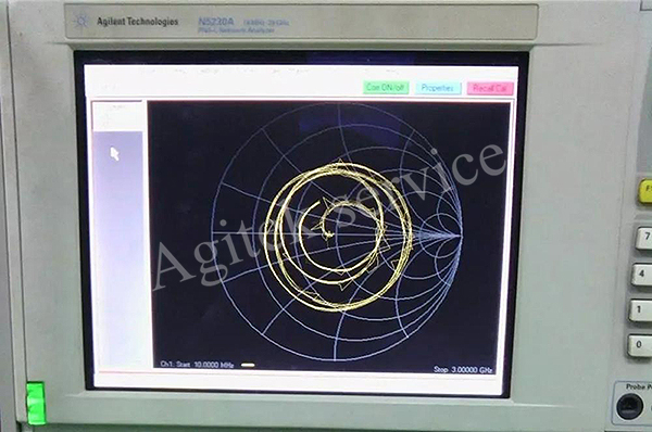 图:用矢量网络分析仪测一台信号源的输出阻抗,此时信号源正在进行扫频工作,可以明显的看到信号源的输出对矢网的干扰(尖峰),事实上阻抗也不正确(圆环状曲线半径变大了)