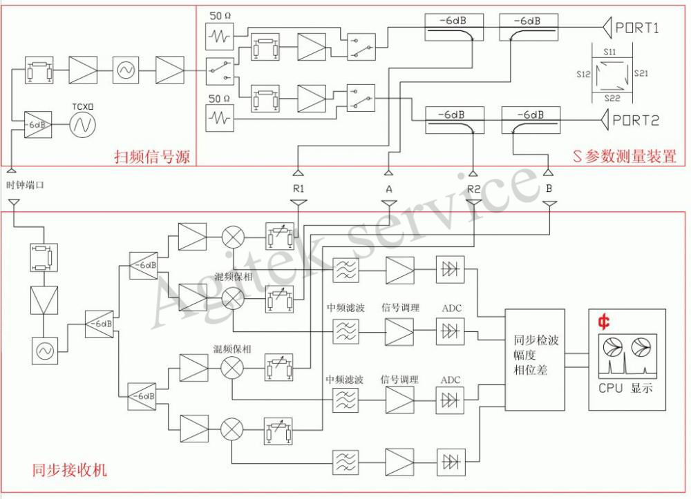 与天线分析仪类似,双端口测试时,幅度的变化、相位的变化可以用幅度检波器、鉴相器等装置加以比较得到。只不过参与比较的不再是正反向信号,而是输入信号和输出信号。
