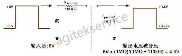 阻性负载相当于在被测电路上并联了一个电阻,对被测信号有分压的作用,影响被测信号的幅度和直流偏置。有时,加上探头时,有故障的电路可能变得正常了。一般推荐探头的电阻R>10倍被测源电阻,以维持小于10%的幅度误差。