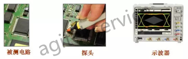 示波器因为有探头的存在而扩展了示波器的应用范围,使得示波器可以在线测试和分析被测电子电路,如下图: