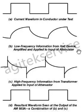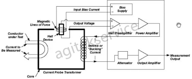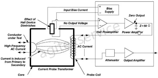随着被测电流频率的增加,霍尔效应逐渐减弱,当测量一个不含直流成分的高频交流电流时,大部分是通过磁场的强弱直接感应到电流探头的线圈。此时,探头就像一个电流变压器,电流探头直接测量的是感应电流,而不是补偿电流,功放的输出为线圈提供一个低阻抗的接地回路。