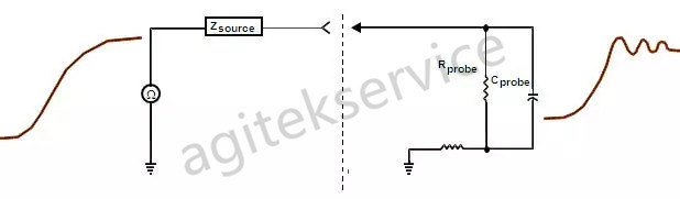 感性负载来源于探头地线的电感效应,这地线电感会与容性负载和阻性负载形成谐振,从而使显示的信号上出现振铃。如果显示的信号上出现明显的振铃,需要检查确认是被测信号的真实特征还是由于接地线引起的振铃,检查确认的方法是使用尽量短的接地线。一般推荐使用尽量短的地线,一般地线电感=1nH/mm。