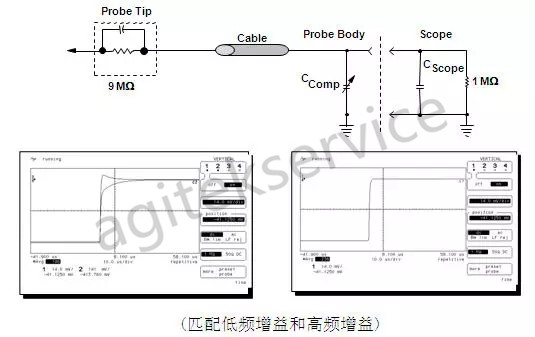 带补偿的高阻无源探头有一个补偿电容,当接上示波器时,一般需要调整电容值(需要使用探头自带的小螺丝刀来调整,调整时把探头连接到示波器补偿输出测试位置),以与示波器输入电容匹配,以消除低频或高频增益。下图的左边是存在高频或低频增益,调整后的补偿信号显示波形如下图的右边所示。