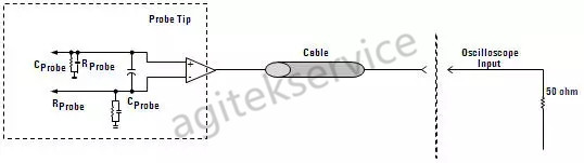 单端有源探头结构图如下,使用放大器实现阻抗变换的目的。单端有源探头的输入阻抗较高(一般达100Kohm以上),而输入电容较小(一般小于1pf),通过探头放大器后连接到示波器,示波器必须使用50ohm输入阻抗。有源探头带宽宽(现在可达30GHz),而负载小,但是价格相对较高(一般每根探头达到同样带宽示波器价格的10%左右),动态范围较小(这个需要注意,因为超过探头动态范围的信号,不能正确测试。一般动态范围5V左右),比较脆弱,使用需小心。