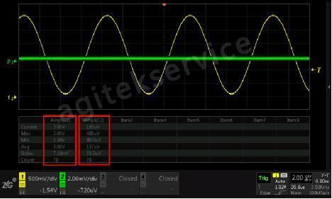 通道隔离度的值越大,通道之间的串扰越小,测试的结果也就越准确!从图2的参数显示结果不难看出,在通道一接入幅值为3V的正弦波信号,通道二在2 mV/div的档位下,幅值仅为157uV,通道间的串扰非常小,保证了测试结果的准确性。