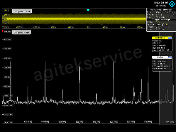 图1:这个例子显示使用近场探头捕获的频谱辐射。采用100kHz分辨率带宽,在605MHz中心频率,RTO示波器进行测量时的本底噪声大约-105dBm。这表明该设备具备微弱信号的分析能力。