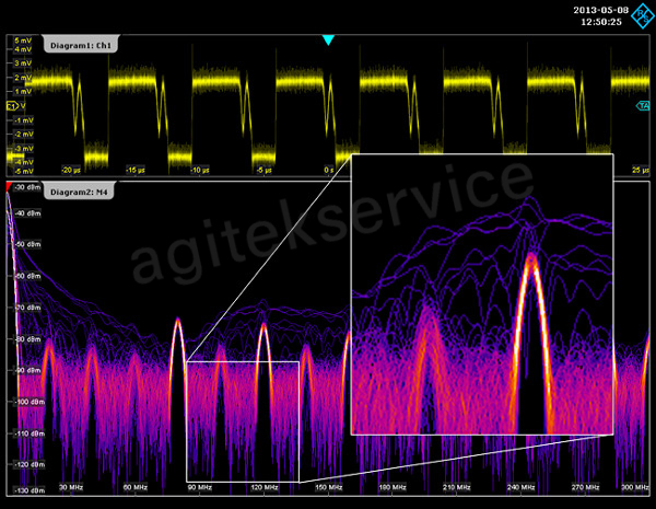 结合选通的FFT分析(它能够将频谱分析限制在用户定义的时间窗内)您现在能够轻松找出时域信号的哪个部分引起频谱显示的哪些特征。这就为分析有害辐射与被捕获时间信号各部分间的相关性创造了条件,从而使您更接近EMI问题的根源。
