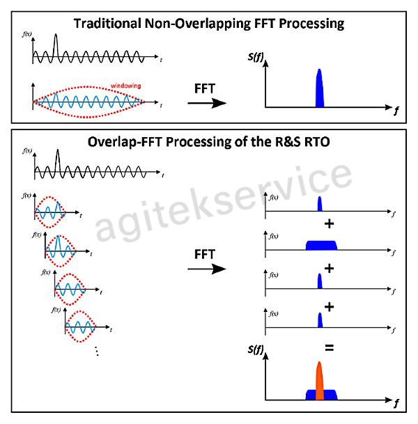图2:重叠FFT处理在进行FFT分析前将记录的信号在时域分割成几部分。这确保分析结果对杂散事件具有高灵敏度,以及能够对各个频谱部分按照它们的发生频率进行灰度分级。