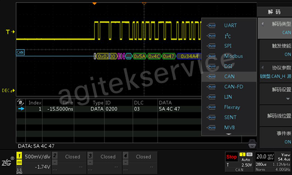ZDS4054Plus示波器标配512M存储深度,可以充分保证长时间捕获波形的高采样率。毕竟只有捕获了正确的波形,才能得到正确的解码。