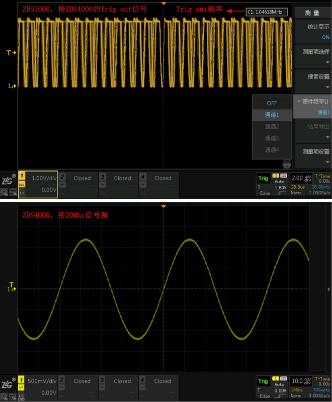 示波器每采样一帧波形,都会在Trig out输出一个脉冲信号,这个Trig out接口通常在示波器背面,因此橙子视频下载可以测量Trig out信号来测量示波器的波形刷新率。橙子视频下载本次要测量ZDS4000示波器的波形刷新率,选用ZDS1000作为测量仪器,其中ZDS4000接20Mhz信号源,ZDS1000接ZDS4000的Trig out信号,如果你手上没有额外的示波器,也可以用逻辑分析仪作为测量仪器。
