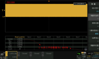 很多人直接将Trig out频率作为波形刷新率,实际上是不准的,因为波形刷新率是指每秒波形捕获的数量,而有的示波器Trig out是间歇性的,也有的是持续性的,最好的办法就是统计Trig out一秒钟的脉冲数量才是准确的波形刷新率。如图 3所示,打开ZDS1000统计测量功能,水平时基设置成100ms档位,总共采样时间为1.4s,RiseCount上升沿计数器为1.4647M,折合1s为1.046M左右,说明ZDS4000示波器最大刷新率为1.046Mwfms/s。