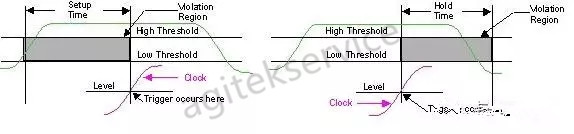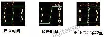 a、建立时间触发:需要定义一个长方形区域作为违规区域(如上图左图所示),违规区域的右边是时钟边沿,左边是预设的建立时间,同时需要设置高低门限。当数据信号波形进入这个区域时,即可判断数据波形违规,示波器就触发这个信号。