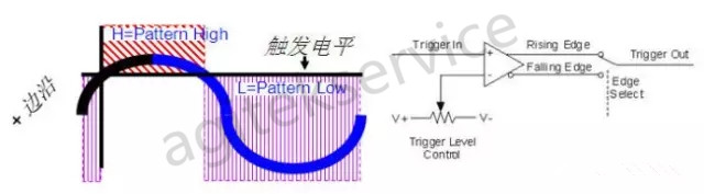 简单的边沿触发器的工作原理如下图所示。首先预设一个触发电平,触发信号与触发电平比较,当触发信号穿越触发电平后,电压比较器立即产生一个快沿触发脉冲,去驱动下一级硬件,这样即可进行边沿触发。