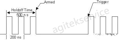 示波器的触发释抑HoldOff对于稳定显示Burst类型的波形是非常重要的。如下图所示,如果没有HoldOff,示波器第一次触发在Burst波形的第一个脉冲,第二次有可能触发在Burst波形的第三个脉冲,这样屏幕看到的就不是稳定的Burst波形串,而左右晃动的波形。示波器采用HoldOff解决这个问题,当示波器第一次触发后,必须在经过HoldOff时间后,才能够进行第二次触发,这样,如果设置HoldOff时间大于Burst波形串的时间,则第二次也会触发到第二个Burst波形的第一个脉冲,这样整个Burst波形串即可稳定的显示在示波器的屏幕上。