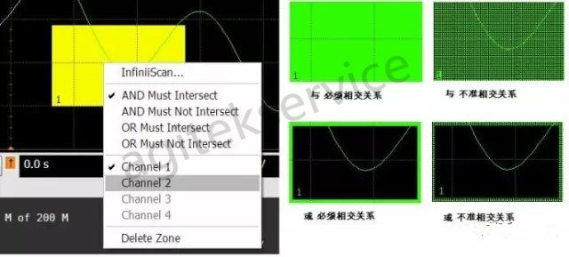 5、区域限定触发:这是InfiniiScan最有特色的触发功能,也是InfiniiScan的亮点所在。InfiniiScan支持在示波器的屏幕上任意用鼠标画8个窗口进行触发,而且8个窗口可以是“与”或“或”的关系,每个窗口都可以选择波形必须相交或不能相交进行触发,这样,InfiniiScan可以触发几乎任何复杂的信号。