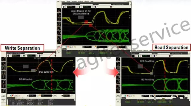DDR1&2&3总线的DQS(源同步时钟)和DQ(源同步数据)信号负责双向传输“读”和“写”数据。DQS和DQ都是三态信号,当“写”操作时,DQS的上升和下降边沿处于DQ的中间位置;当“读”操作时,DQS的上升和下降边沿处于DQ边沿的位置。所以导致,累积显示波形时,屏幕上是杂乱的一团,没法进行各种参数的测量。但是因为DQS的“写”操作波形和“读”操作波形是不同的,这样可以采用画图的方式进行触发。首先画一个不准交叉的图形,以隔离“三态”波形,然后画必须交叉图形,以触发“读”或“写”波形。当DQS只触发“读”或“写”波形时,因为示波器通道时同步的,所以捕获的DQ波形也是“读”或“写”波形。从而可以单独获得“读”或“写”的眼图,然后再进行“读”或“写”波形的参数测量。