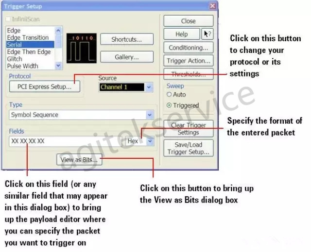 前面所述的触发条件大都是单个波形的触发,能否进行串行信号协议触发(触发连续的一串数据或协议)呢?现在各种示波器也有了这个功能,但是很多都是用软件来实现的,也有用硬件FPGA来实现的(比如Infiniim9000A和InfiniiVision7000B系列示波器,内置FPGA,实现数据加速处理和串行协议触发)。软件实现的问题是可能会丢掉很多满足触发条件的数据,因为用软件实现是先捕获波形,再从波形里搜索串行协议触发条件,而示波器是没有办法全时间实时捕获波形的,所以可能或丢失很多触发条件。如果要软触发发挥作用,可以增大示波器的存储深度,在存储深度内,搜索触发条件可以做到捕获的时间内不丢失触发条件。