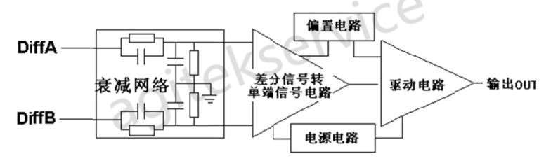 差分探头主要由衰减网络,差分信号转单端信号输出,电源电路,偏置电路,驱动电路组成,其常见原理框图如下: