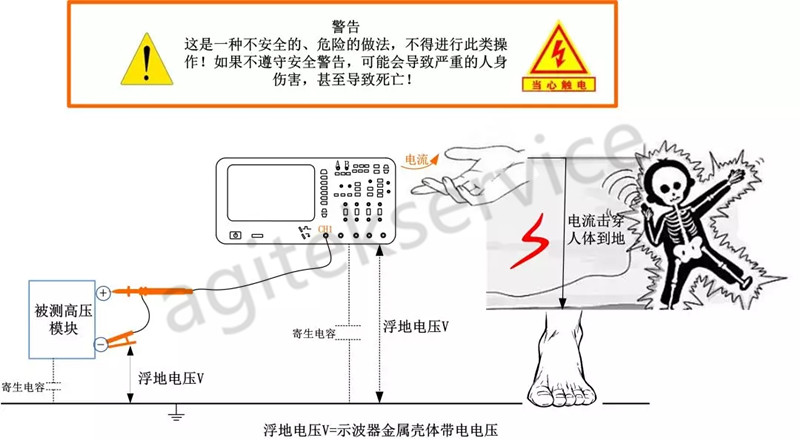 使用探头进行测量时,最重要的就是安全问题。比如使用无源探头时,探头的地线与示波器的地是连接在一起的,当示波器安全接地的时候,探头是安全的。但是当示波器没有安全接地时,探头的地线就会存在一定的电压从而给使用者带来危险。具体情况如图5所示: