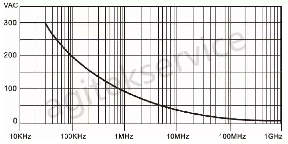 最大输入电压是指探头可以输入的最大额定值的电压。最大输入电压取决于探头机身和探头内部器件的额定击穿电压。一般该项会通过一些安规规范来给出,而不是给出单一的电压,比如一般10×的无源探头的最大输入电压为300VRMSCATⅡ。其中CATⅡ指的是一类测试场景,300VRMSCATⅡ指的是在这类测试场景下可以测量的最大电压。而且这个电压并不是一个恒定值。而是会随着频率的变化而变化。一般探头会给出自己的电压额定曲线,如下图所示: