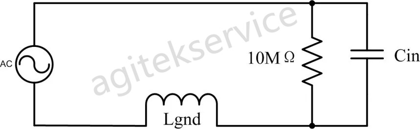 由于地夹线比较长,其会形成一个寄生电感Lgnd,随着夹线的增长,这个电感也会增大,而这个回路电感会和示波器探头的输入电容Cin产生谐振。这就导致示波器的幅频特性变得不平坦,导致测量不准确。下图为使用接地夹时的等效电路。