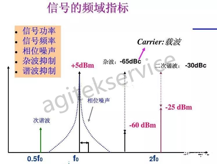 下面是信号的频域指标(功率、相位噪声、杂散、谐波),均可以用频谱仪进行测试。