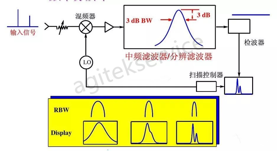 较宽的RBW较能充分地反应输入信号频谱的波形与振幅,但较低的RBW将能区别不同频率的信号。也就是说RBW代表两个不同频率的信号能够被清楚的分辨出来的最低带宽差异,两个不同频率的信号带宽如低于频谱分析仪的RBW,此时该两信号将重迭,难以分辨,较低的RBW固然有助于不同频率信号的分辨与量测,低的RBW将滤除较高频率的信号成份,导致信号显示时产生失真,失真值与设定的RBW密切相关,较高的RBW固然有助于宽带带信号的侦测,将增加噪声底层值(NoiseFloor),降低量测灵敏度,对于侦测低强度的信号易产生阻碍。