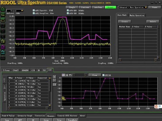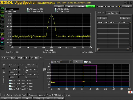 由于受限于仪器操作形式的限制(仪器上的旋钮、键盘、菜单等),仪器本身编辑模版、显示测量结果都非常不方便。为解决这一问题,RIGOLDSA1000(A)系列频谱仪提供上位机应用工具UltraSpectrum通过借助PC操作方式(鼠标、键盘等)解决了PassFail应用方上快速编辑模版,借助PC丰富的显示资源,提供更加丰富的数据分析途径。