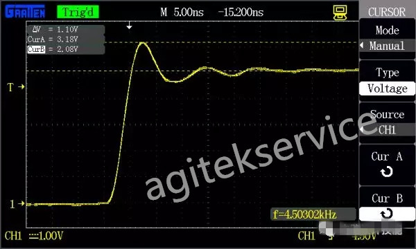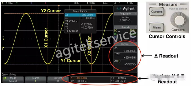 4.手动测量波形参数-可以通过移动光标读数、计算得到,移动光标的时候时间和电压值都会发生变化。一般光标都是成对出现,你可以通过读取两个光标之间的差值得到需要的信息。