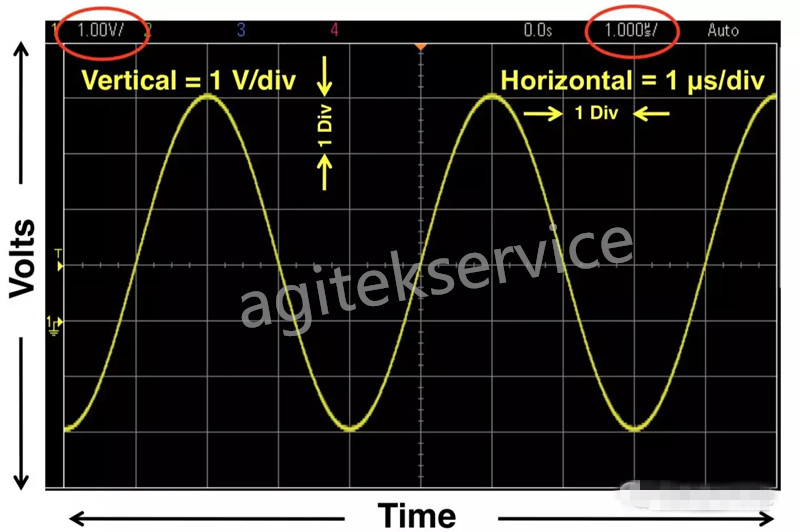 示波器的显示界面一般都是通过多条水平和竖直的线交错构成的格状,竖直的刻度单位为伏/格,水平的刻度单位为秒/格。一般来讲示波器的显示屏在竖向(伏)有8-10个格,在横向(秒)有10-14个格。