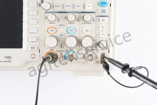 示波器一般在其面板的右下方都会提供一个内部产生、供校准用的高可靠、固定频率和幅度的方波测试信号,它有两个分开的连接点-一个输出校正信号,一个连接系统的地。将探头的接地夹子连接到这个测试信号的接地端,示波器的探头连接到测试信号的输出。