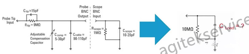 对于被测的电路来讲示波器探头+示波器等效为一个10MΩ的电阻和Cload的并联,对被测电路工作的影响可以根据这个等效电路来计算。