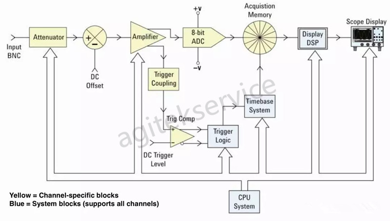 数字vs.模拟–早期的模拟示波器将输入的电压以电子束的方式直接打在显示屏上;数字示波器内部由微处理器控制,通过模数转换器(ADC)将输入的模拟信号进行量化,并经过一系列的处理后将量化的波形显示出来。一般来讲,早期的模拟示波器带宽相对较低,功能较少,但响应时间也许更快,且没有数字示波器由于采样带来的混叠频率,随着科技的发展目前主流的都已经是数字示波器,除非特殊的场合需要模拟示波器;