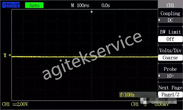 将探头连接到示波器的第一个通道,打开示波器开关开始运行,你可以看到示波器屏幕上的方格、刻度以及由一条水平线构成的波形,带着微弱的噪声波动。