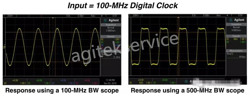 带宽–能够可靠测量的模拟信号的频率范围,一般以MHz为单位来表示,下面的图可以看出来如果模拟带宽不够对被测波形的影响。