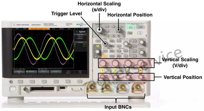 各种示波器的功能基本上都是一样的,它们都有一些共同的属性-显示、水平线、垂直线、触发、输入等。