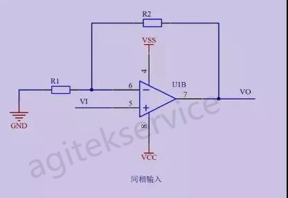 上图为同相运放电路原理,输出公式为:VO=VI×(1+R2/R1)