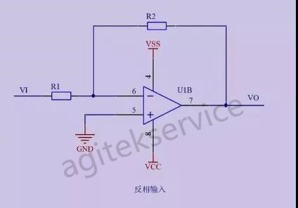 上图为反向输入运放原理,输出公式为:VO=-VI×(R2/R1)。