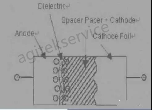 如图为铝电解电容的基本结构,它由阳极(anode)、在绝缘介质上附着的氧化铝构成的铝层,接收极的阴极铝层,和真正的由电解液构成的阴极。电解液浸透在两个铝层间的纸上。氧化铝层是通过电镀在铝层上,相对于加在其上的电压来说是非常薄的,很容易被击穿,导致电容失效。