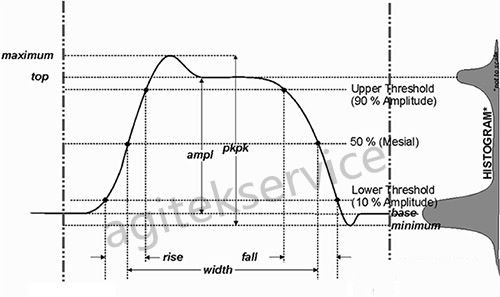 IEEE标准规定应绘制波形样本直方图。脉冲直方图将有两个峰值。较高峰值的平均值为脉冲顶部,较低峰值的平均值为脉冲底部。使用这些平均值可以消除噪声对确定脉冲振幅的影响。因此,周期、宽度、过冲、上升时间和下降时间都可以得到更加精确的计算。