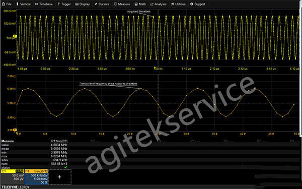 采集的信号为调频正弦波;信号频率逐周期测量,并在数学轨迹F1中绘制为趋势图。趋势图的垂直轴以赫兹(Hz)为单位,而水平轴则为测量顺序编号。趋势图可能有20至1,000,000个点,级数为1-2-5。这些趋势图与源轨迹同步,但必须绘制相同的点数。