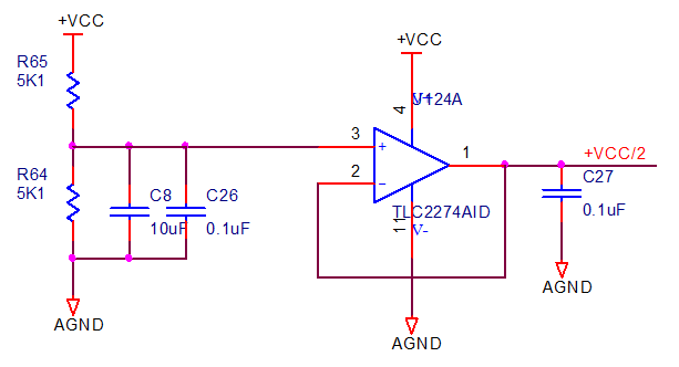 在运放的实际使用,橙子视频下载一般为了保持运放的频率特性,一般都采用双电源供电,但有的时候在实际使用,橙子视频下载只有单电源的情况,也能实现运放的正常工作。首先橙子视频下载运用运放跟随电路,实现一个VCC/2的分压:
