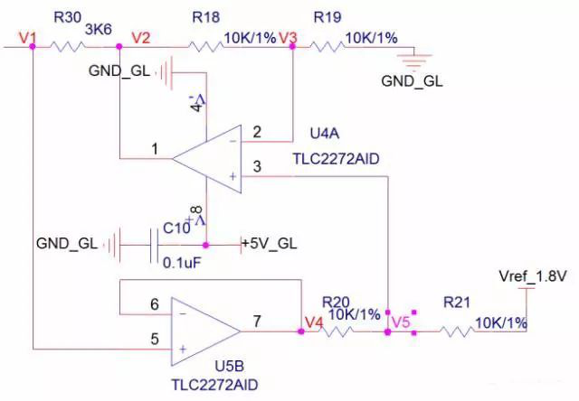 U5B(上图中下边的运放)为电压跟随器,故V1=V4;