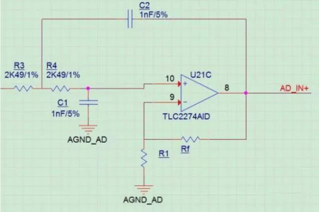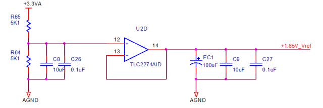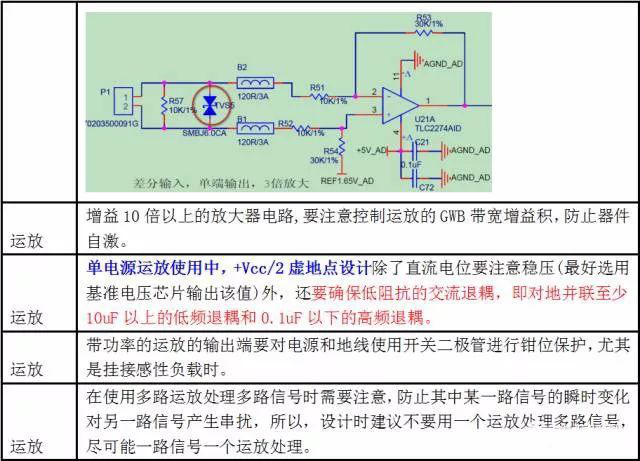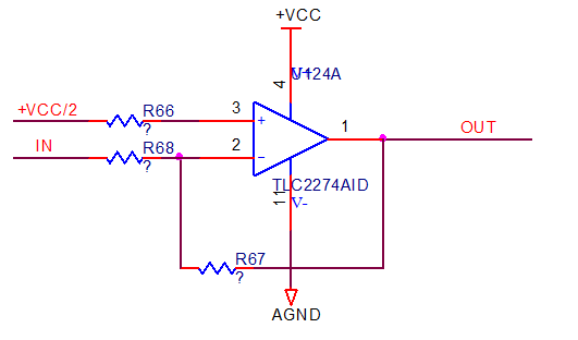 该电路中R66=R67//R68,信号的输出增益G=-R67/R68。具体应用如下图。运放为单+5V_AD供电,AD芯片的电压是3.3V(基准电压芯片REF3033得到),该3.3V再电阻分压和经过运放跟随后得到1.65V,给到运放的同相输入端